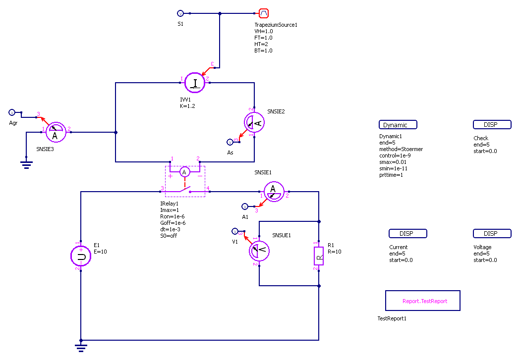 Трапециевидный сигнал от TrapeziumSource1 поступает на датчик S1 и управляет источником тока IVV1.