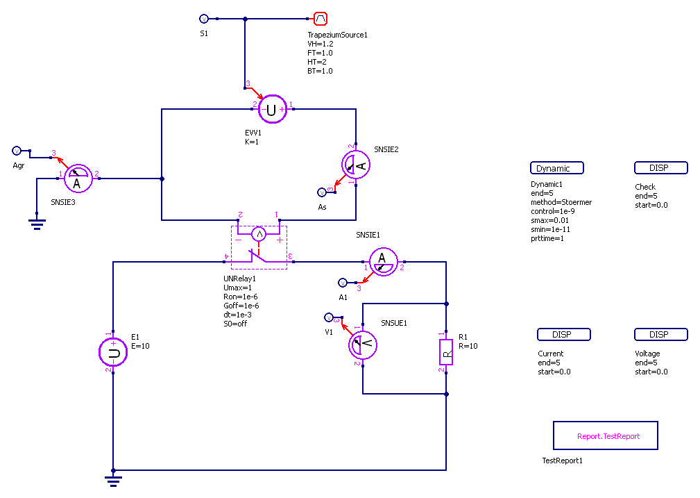 Сигнал от TrapeziumSource1 поступает на датчик S1 и управляет источником тока EVV1.