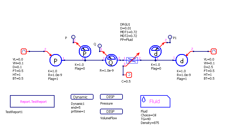 Модель DRGU - Дроссель гидравлический управляемый Тест: Проверка значения объемного расхода при перепаде давлений от 0 до 0.1 МПа в прямом и обратном направлениях с подаваемым сигналом на сигнальный порт дросселя = 0.5. Дроссель гидравлический управляемый, DRGU D=0.01 - Условный проход, м MDT1=0.72 - Коэффициент расхода при течении 1-2 MDT2=0.72 - Коэффициент расхода при течении 2-1 FP=Fluid - Свойства жидкости Подаваемый сигнал Sign = Const = 0.5 Результат: Так как трение по длине и шероховатость отсутствуют, вклад сопротивления по длине трубы отсутствует. Расчет можно произвести с достаточной точностью по формуле Бернулли: Qv = Sign * MDT * S * sqrt (2 * dp / ro) При максальных по модулю перепадах = 0.1 МПа (100000Па): |Qv| = 0.5 * 0.72 * 0,00007853981634 * sqrt (2 * 100000 / 875) = 0,0004275 м3/с = 25,648 л/мин.