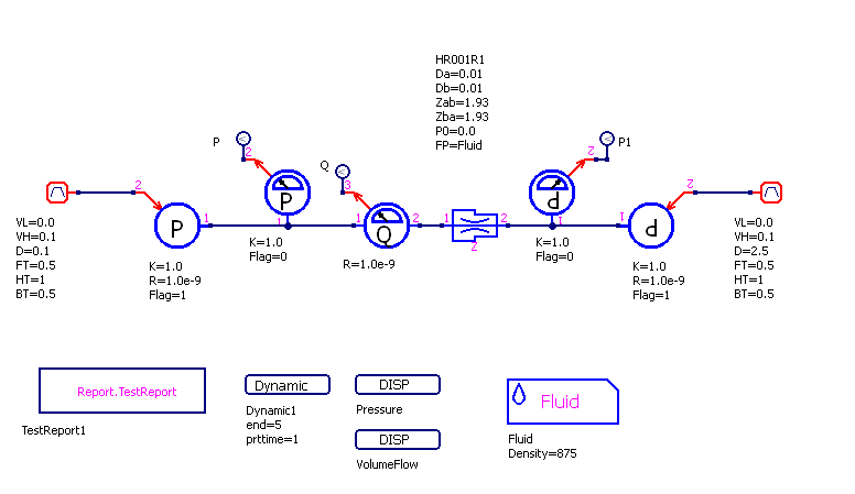 Модель HR001R - Гидравлическая модель с портами A и B Тест: Проверка значения объемного расхода при перепаде давлений от 0 до 0.1 МПа в прямом и обратном направлениях. Гидравлическая модель с портами A и B, HR001R Da=0.01 - Гидравлический диаметр на порту A, m Db=0.01 - Гидравлический диаметр на порт B, m Zab=1.93 - Прямой коэффициент сопротивления Zba=1.93 - Обратный коэффициент сопротивления P0=0.0 - Начальное давление, MPa FP=Fluid - Свойства жидкости Результат: Так как трение по длине и шероховатость отсутствуют, вклад сопротивления по длине трубы отсутствует. Расчет можно произвести с достаточной точностью по формуле Бернулли: Qv = MDT * S * sqrt (2 * dp / ro) При максальных по модулю перепадах = 0.1 МПа (100000Па): |Qv| = 0.72 * 0,00007853981634 * sqrt (2 * 100000 / 875) = 0,000855 м3/с = 51,29612979 л/мин.