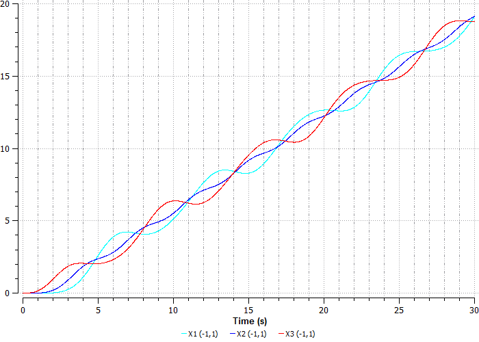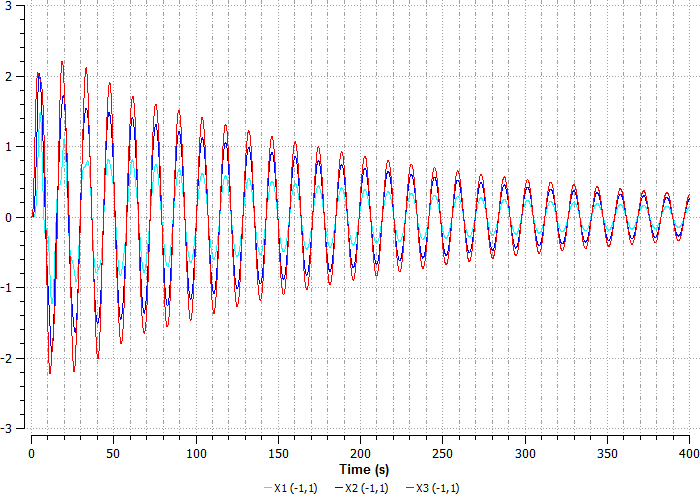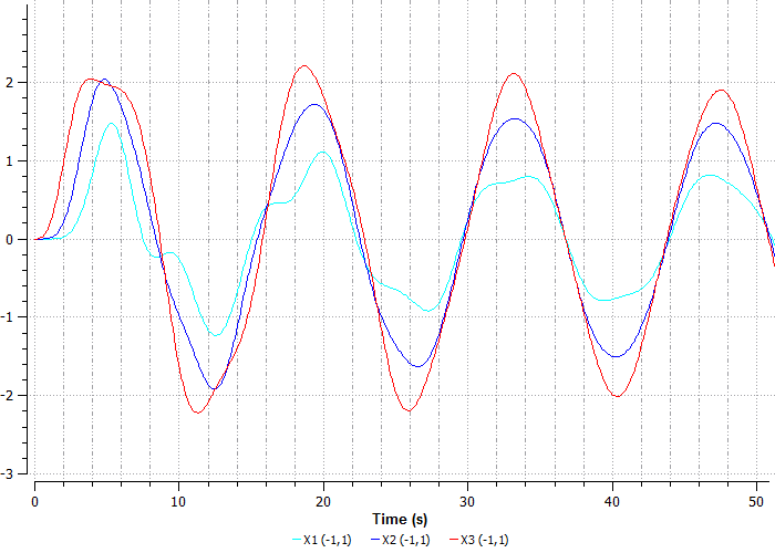 На графике видно, что сила, приложенная к третьему шару, начинает его перемещать, затем начинает перемещаться второй шар, соединенный пружиной с третьим, а дальше перемещается первый шар, соединенный со вторым, и так далее.