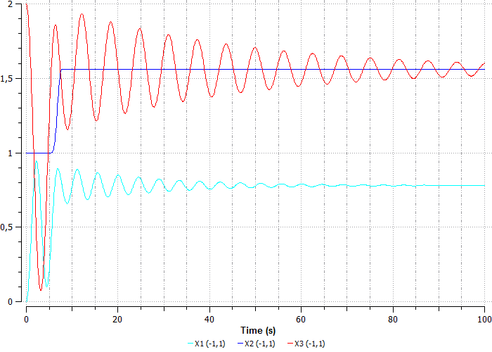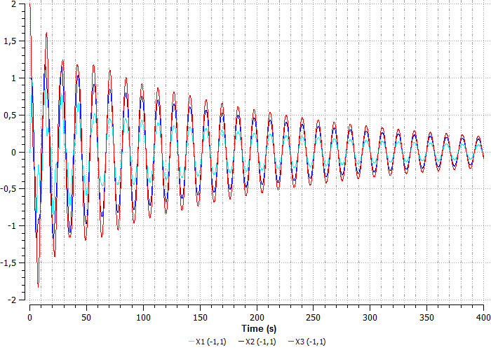 На схеме M1D1, M1D2, M1D3 – шары, массой 1 кг, K1, K2 – жесткости, соединяющие шары, равные 1 Н/м, FTR1 – переменная сила с амплитудой 1 Н. начальное положение всех шаров равно 0, т.е все шары находятся в одной точке, X1, X2, X3 – индикаторы перемещений шаров M1D1, M1D2, M1D3 соответственно.