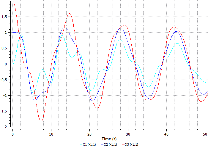 На графике видно, что шары начинают колебания с разного начального положения, каждая пружина «сжимаясь» тянет шары за собой.