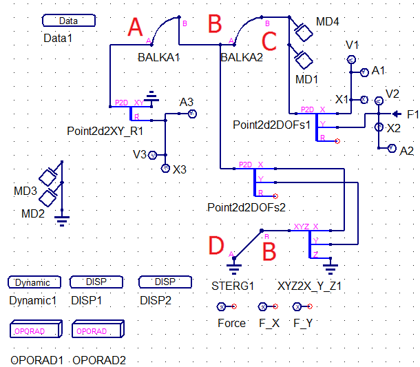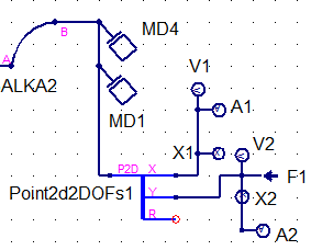Узел С (рисунок 14) представляет собой двумерный узел, к которому приложена вертикальная сила (вдоль оси Y). Сплиттер Point2d2DOFs1 разделяет узел, а индикаторы V1, A1 и X1 показывают у степени свободы X скорость, ускорение и перемещение. У степени свободы Y индикаторы V2, A2 и X2 показывают скорость, ускорение и перемещение. Так же к степени свободы Y приложена сила F1.