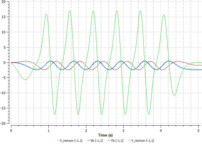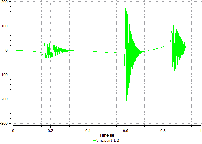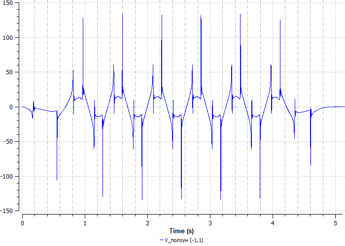 На графике видно, шатун растягивается, и, когда он проходит «мертвую» точку, начинает двигаться с высокой скоростью.