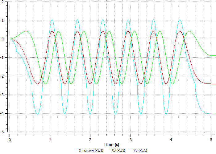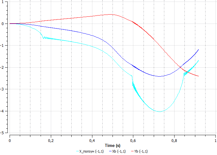 На графике видно, что возникают колебания. Это происходит потому, что заданная длина шатуна не позволяет кривошипу сделать оборот, тем самым кривошип изгибается (деформируется). В точке, когда длина балки шатуна оказывается предельной для работы механизма, его заклинивает.