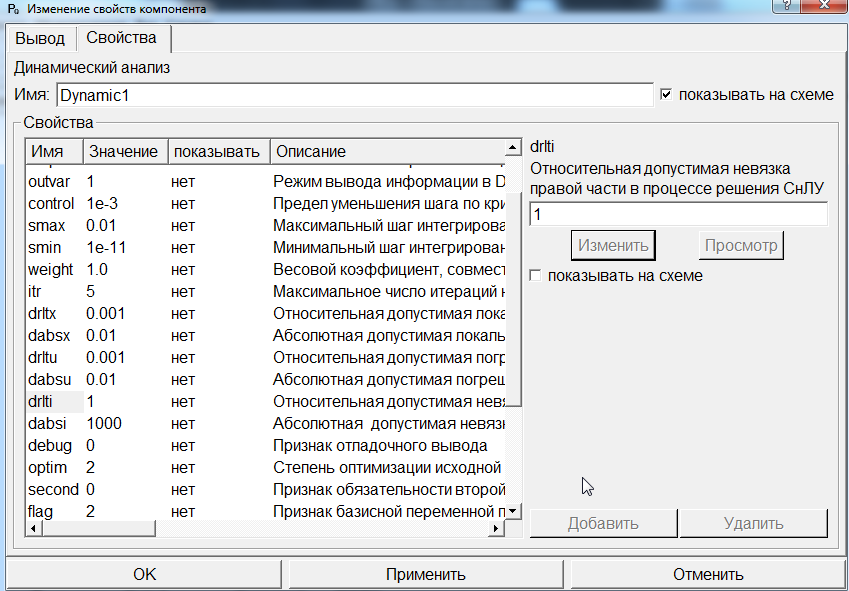 Изменив некоторые параметры, можно «заставить» механизм работать. Для этого настроим параметры решателя на высокие нагрузки, изменив параметры компонента Dynamic1 (рисунок 23), и уменьшим упругость шатуна в 10 раз, изменив параметры компонента BALKA2 (рисунок 24). Сохраним под названием crank_3.sch.