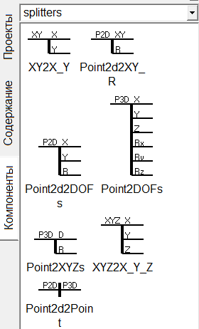 Сплиттеры – инструмент в ПК PRADIS, позволяющий работать с каждой степенью свободы узла по отдельности. Находятся в модуле splitters окна «Компоненты» (рисунок 4).